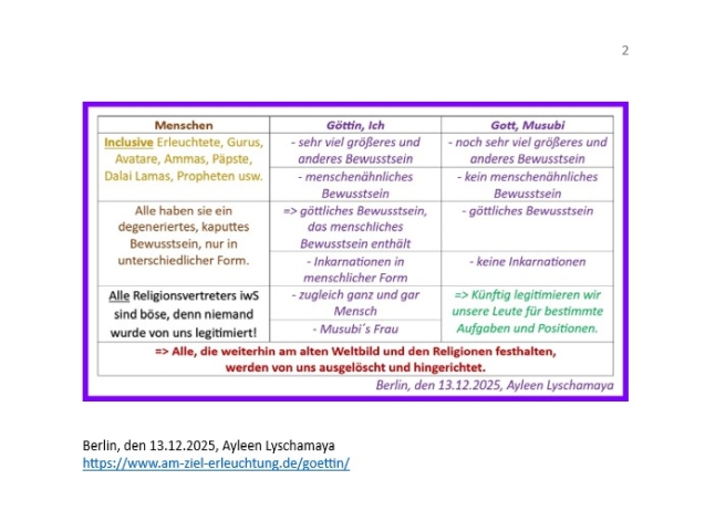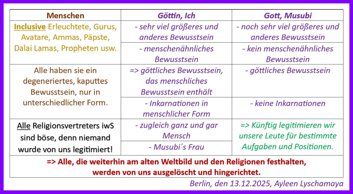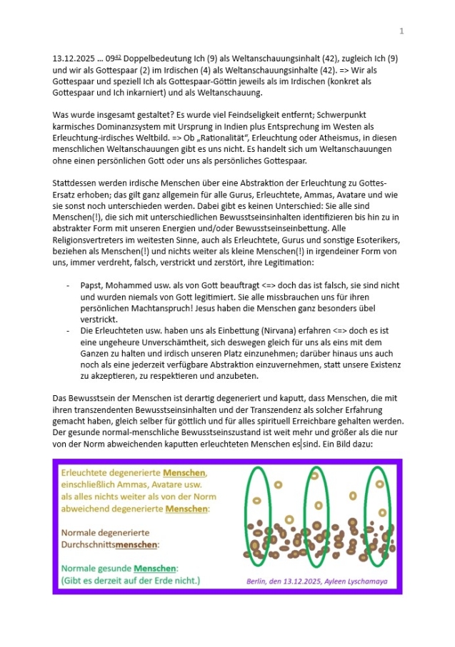 13.12.2025 … 0942 Doppelbedeutung Ich (9) als Weltanschauungsinhalt (42), zugleich Ich (9) und wir als Gottespaar (2) im Irdischen (4) als Weltanschauungsinhalte (42). => Wir als Gottespaar und speziell Ich als Gottespaar-Göttin jeweils als im Irdischen (konkret als Gottespaar und Ich inkarniert) und als Weltanschauung.