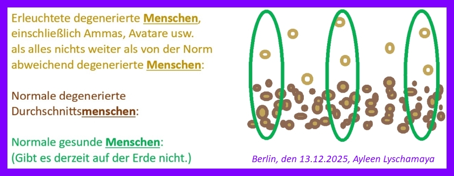 Das Bewusstsein der Menschen ist derartig degeneriert und kaputt, dass Menschen, die mit ihren transzendenten Bewusstseinsinhalten und der Transzendenz als solcher Erfahrung gemacht haben, gleich selber für göttlich und für alles spirituell Erreichbare gehalten werden. Der gesunde normal-menschliche Bewusstseinszustand ist weit mehr und größer als die nur von der Norm abweichenden kaputten erleuchteten Menschen es sind. Ein Bild dazu: